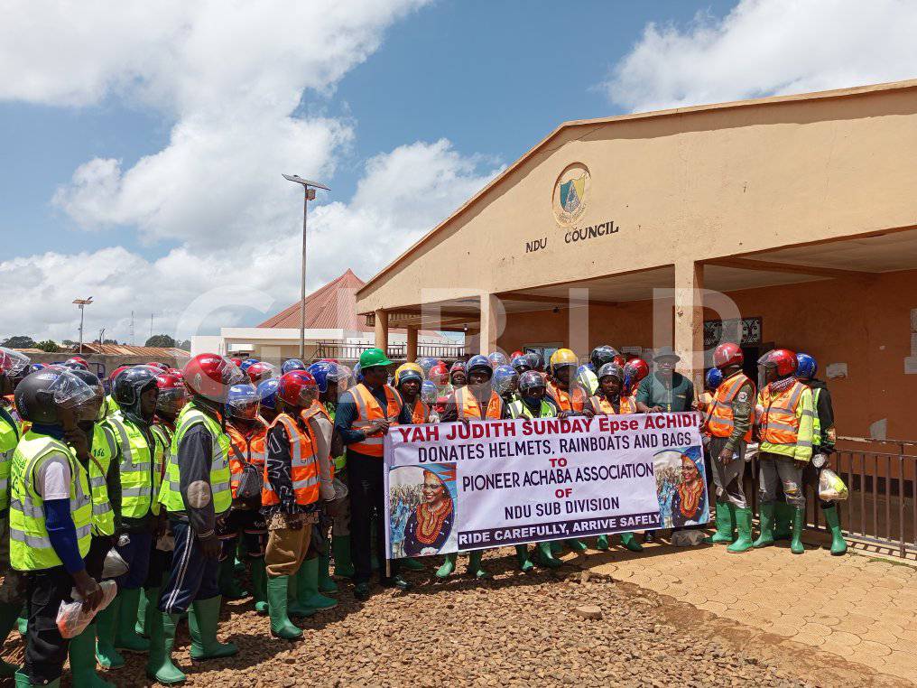 Ndu, Cameroon – July 25, 2025 – In a significant gesture aimed at enhancing road safety and empowering local transport operators, Madam Yah Judith Sunday epse Achidi, the distinguished Director General of Camtel and a prominent elite of Ndu, has generously donated hundreds of helmets, rain boots, jackets, and bags to the Achaba Association of Ndu Sub-division. This timely initiative underscores her commitment to the well-being of her community, particularly as the much-anticipated Ring Road project progresses.
